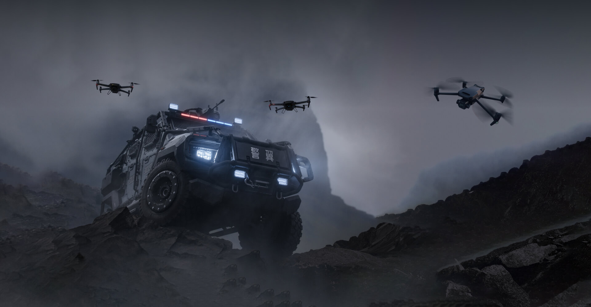 集无人机、无人机指控系统、一体化机库等装备于一体的无人化指挥警车。